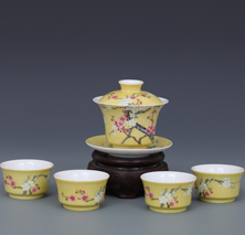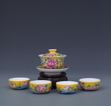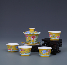 | |  | 珐琅彩黄地牡丹图盖碗套组 限量:全球限量99件 尺寸:盖碗:口径:9.5cm 足径:4.5cm 器高:5.5cm 托盘:10cm 单杯:口径:7cm 足径:3cm 器高:3.5cm |
