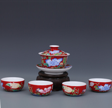 |  | 珐琅彩红地罂粟盖碗套组 限量:全球限量99件 尺寸:口径:9.5cm 足径:4.5cm 器高:5.5cm 托盘:10cm |