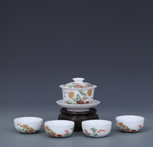 | 珐琅彩灵芝水仙图盖碗套组 限量:99件 尺寸:盖碗:口径:9.5cm 足径:4.5cm 器高:5.5cm 托盘:10cm 单杯:口径:7cm足径:3cm 器高:3.5cm |