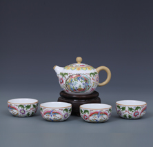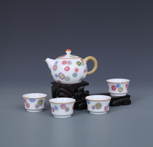 | 珐琅彩白地团花纹描金茶壶套组 限量:99件 尺寸:茶壶:口径:5.5cm 足径:6 cm 器高:8.5cm 腹径:10cm 茶杯:口径:6.5cm 足径:4cm 器高:4cm |