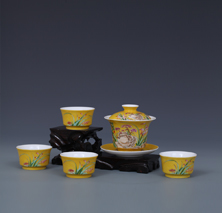 |  | 珐琅彩黄地兰草图马蹄盖碗套组 限量:99件 尺寸:盖碗:口径:9.5cm 足径:4.5cm 器高:6cm 托盘:10cm 单杯:口径:6.5cm 足径:4cm 器高:4cm |