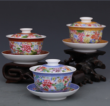 珐琅彩富贵花鸟万花盖碗套组 (蓝边 红边 黄边)