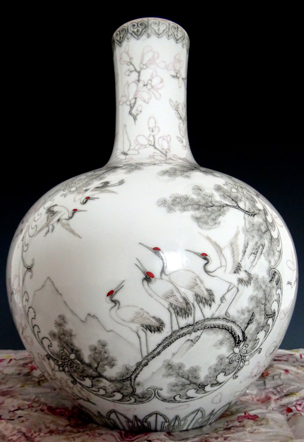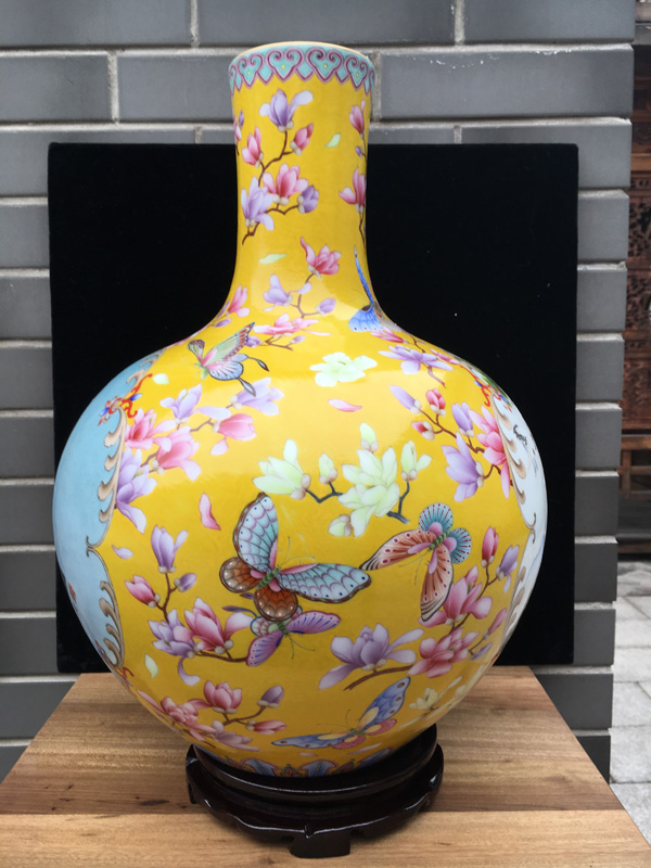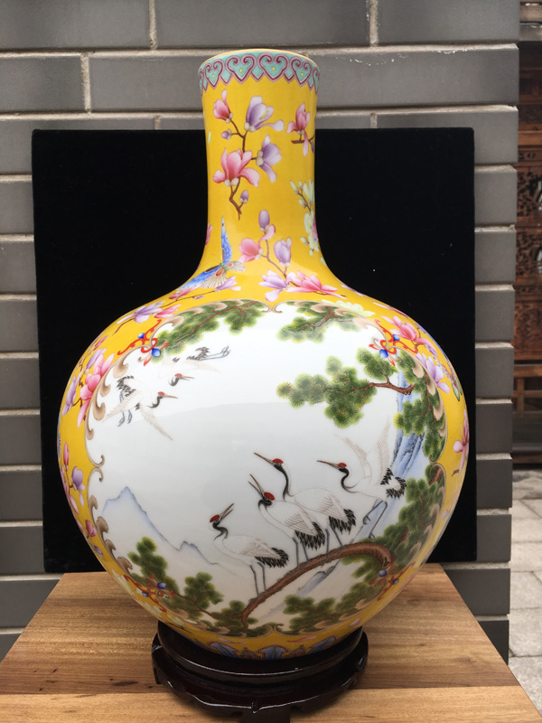珐琅彩黄地开光六鹤同春天球瓶