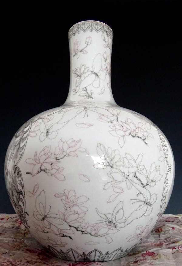器物简介:此器直颈,丰肩,假圈足,施白釉,内无纹饰,双开光,上绘蝴蝶穿木兰花图及六鹤同春图;“木兰花”为朝鲜国花;“六鹤”谐音“六合”,六合同春象征天下太平,如春天一样繁荣昌盛,亦称“乾坤六合”。“六合”泛指天地四方。