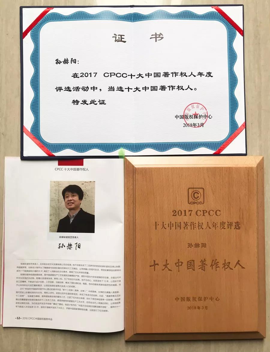 作为本次“十大中国著作权人”获奖人之一,孙赫阳,宫廷珐琅彩技艺复活者,政合宫宫廷珐琅彩创始人。他不但使失传了二百多年的宫廷珐琅彩瓷出技艺得以恢复,并创新设计制作出了雕塑瓷与珐琅彩融合的新时代工艺精品,让传统融入到现代生活,将宫廷奢侈品创新转化成为一个极具版权价值的大IP,满足了中国人民群众的文化需求,提高了的话传统的质量。