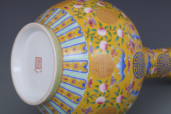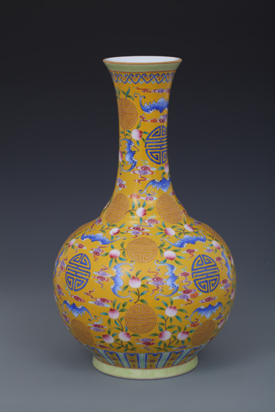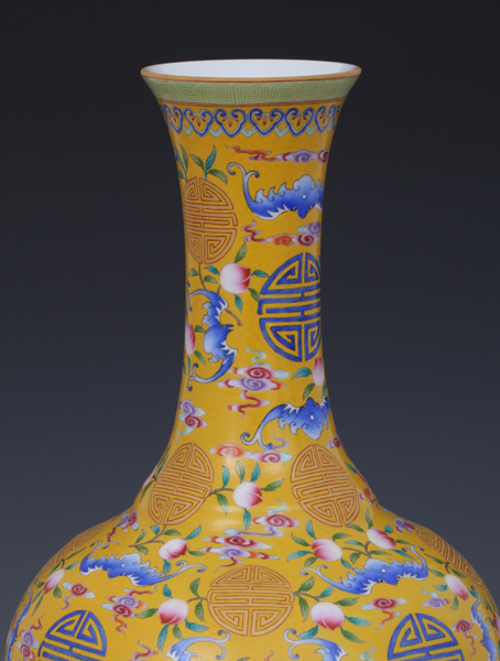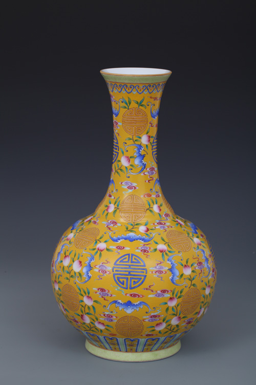 器型简介:此器撇口,细长颈,肩部装饰凸弦纹,圆腹,圈足,施白釉,内无纹饰,外壁纯手工满施黄色地,上绘寿桃,蝙蝠,描金团寿纹及如意云纹,表达着无限美好愿景,黄色地的衬托,动与静的呼应,完美的诠释着画面所要表达的美好寓意。喻福寿双全,如意吉祥之意!