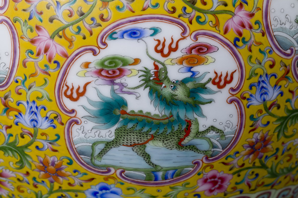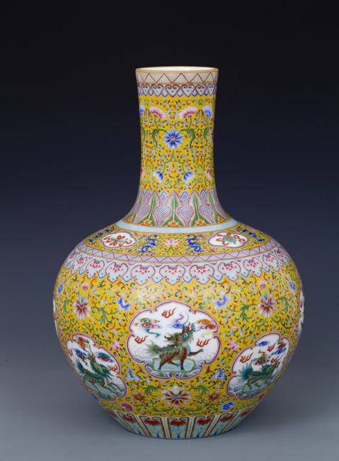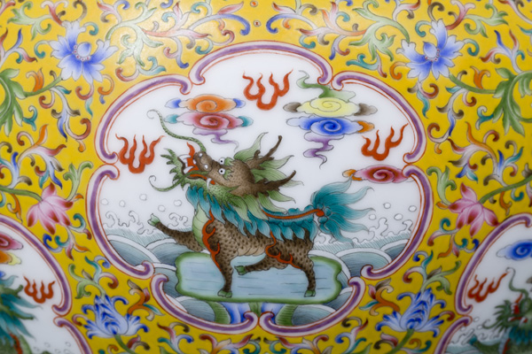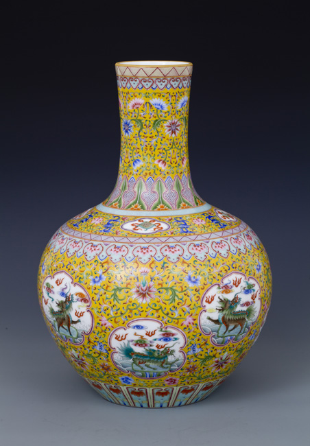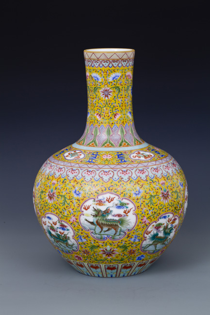 器物简介:此器直颈,丰肩,假圈足,施白釉,内无纹饰,外壁纯手工满施黄色地,上绘缠枝莲纹及八只形态各异象征着仁慈和祥的麒麟,整体画面线条严谨,繁简有致,颈肩部饰以蕉叶纹及如意云纹,动与静之间无不诠释着人们内心无限吉祥美好的愿景,黄色地的衬托,令此器愈显高贵庄重,是不可多得的精工之作。麒麟,集祥瑞寓意于一身,神性通灵显贵,祥瑞之兽,吉祥神兽,主太平,长寿,喻杰出,长寿,品德高尚,事业昌隆之意,底足有红料彩双方栏“政合宫”三字篆书款。