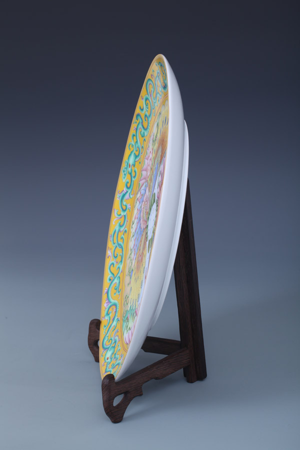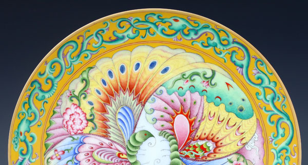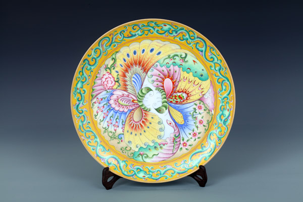 器物简介:此作品依据清乾隆瓷胎画珐琅对蝶纹盘相关资料制作。此器敞口,浅弧壁,圈足,施白釉,外壁无纹饰,口弦描金,内壁纯手工满施黄色地,上绘色彩惊艳,斑斓奇目的对蝶纹饰,在五彩缤纷的蝶翼上,每一处细细的笔触都体现着精妙的纯手工套色技艺所带来的令人震撼的立体感与真实透明质感,极富观赏性。喻坚贞幸福,至尊富贵,和谐美好之意。