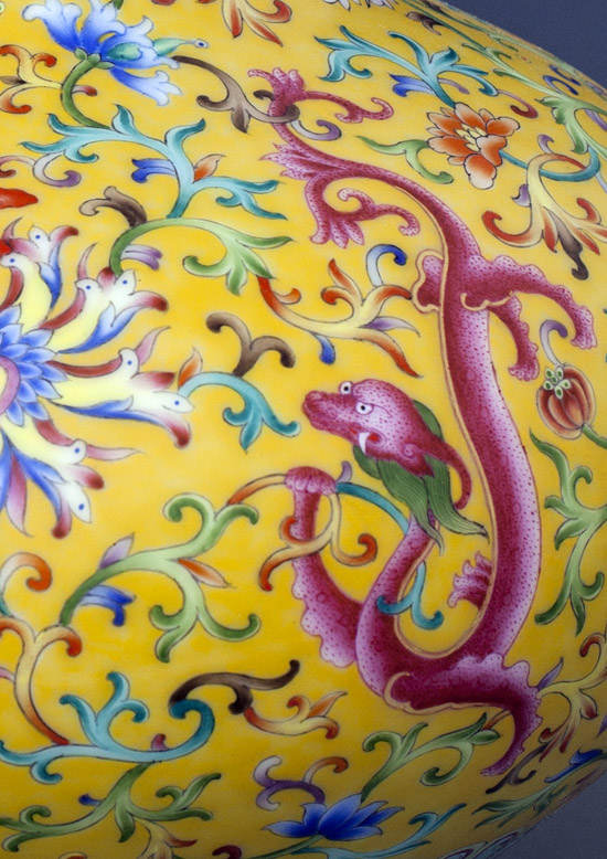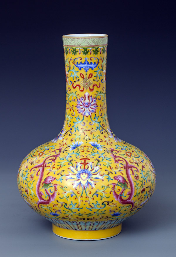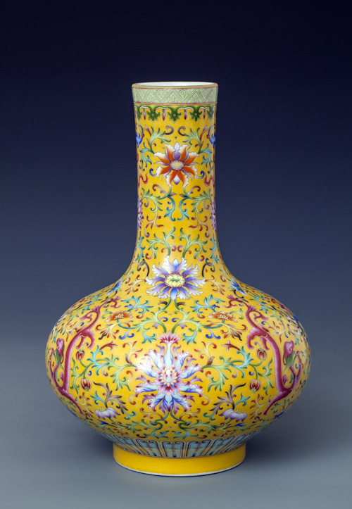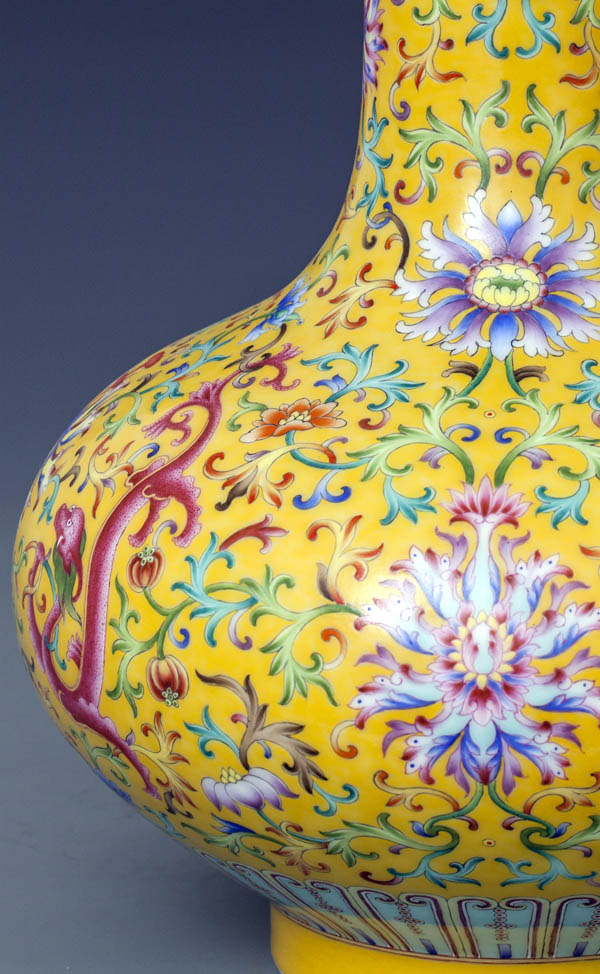 器物简介:此器施白釉,内无纹饰,长颈,丰肩,腹扁圆,圈足。外壁纯手工满施黄色地,上绘缠枝宝相花纹,画面绘工精美,枝蔓缠绵,线条流畅,套色技艺精妙细腻。喻如意祥瑞,百世安康,福寿延绵之意。