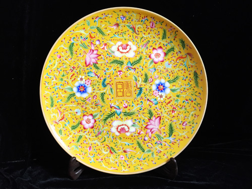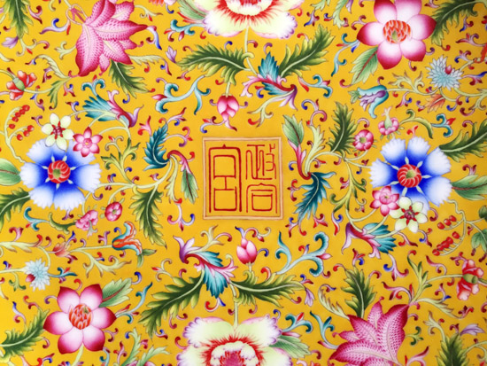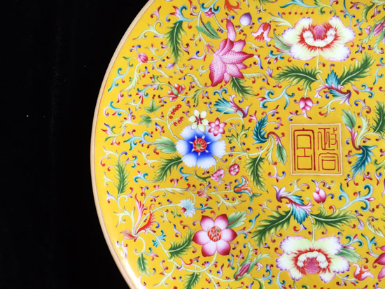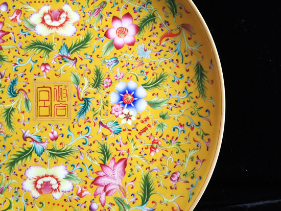 器物简介:此器敞口,浅弧壁,圈足,施白釉,外壁无纹饰,内壁纯手工满施黄色地,中心饰以政合宫三字篆书款,上绘枝蔓缠绵不绝,极富吉祥寓意的缠枝西花纹饰,笔触细腻精致,色调艳丽明快,黄色地的衬托下,画面层次感凸显,极富观赏性。喻繁荣兴盛,生生不息,万代绵长之意。