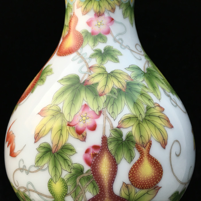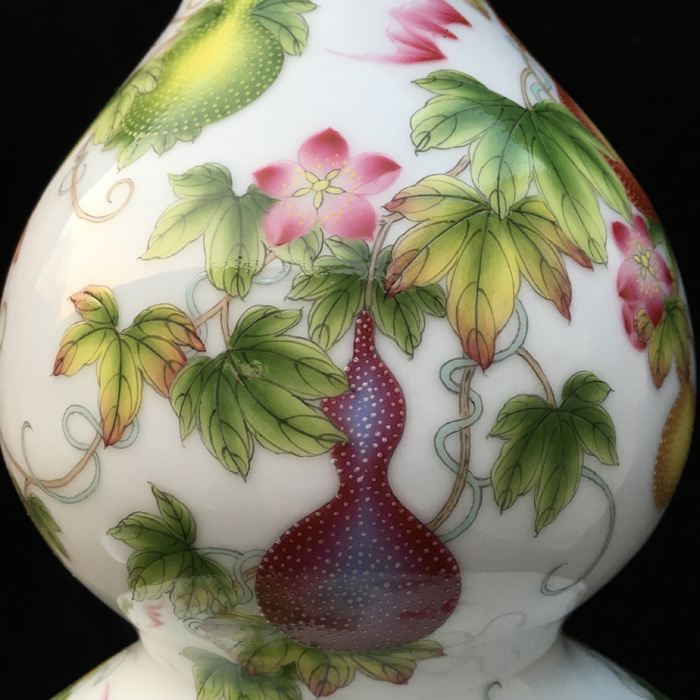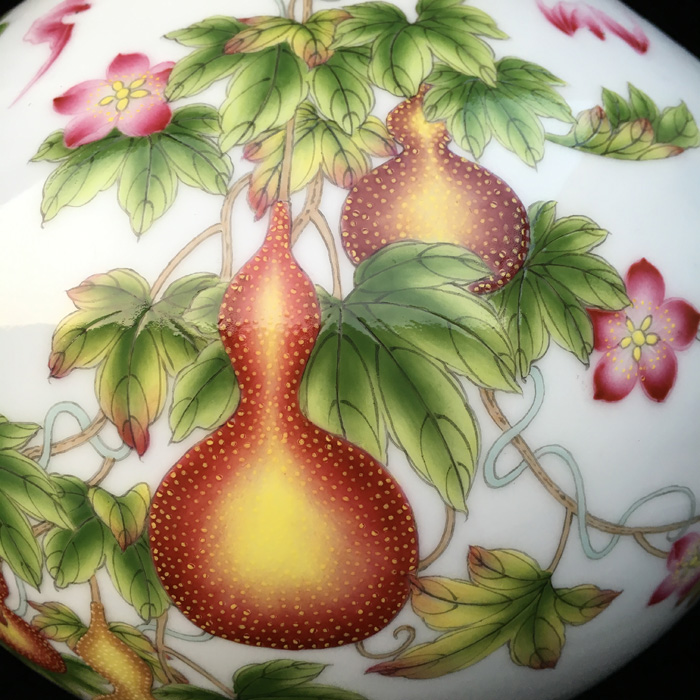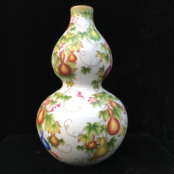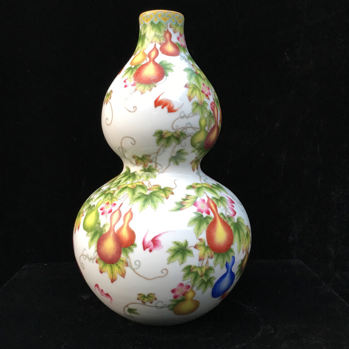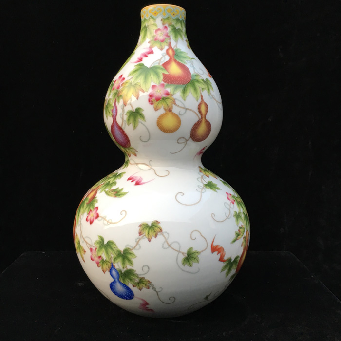 器物简介:葫芦瓶:此为形似葫芦的瓶式,因其谐音"福禄",且器形像“吉”字,故又名“大吉瓶。此器为两节葫芦式,短颈,施白釉,内无纹饰,外壁绘有蝙蝠葫芦图,枝繁叶茂,延绵不息。葫芦,谐音“福禄”。因它是草本植物,其枝茎称为“蔓”。“蔓”与“万”谐音,“蔓带”与“万代”谐音。“福禄”“万代”即是“福禄寿”齐全,故它是吉祥的象征。葫芦与它的茎叶一起被称为“子孙万代”喻家族人丁兴旺,福禄万代,世世荣昌之意。