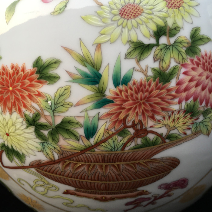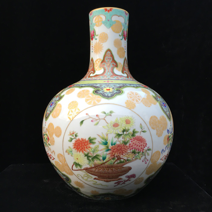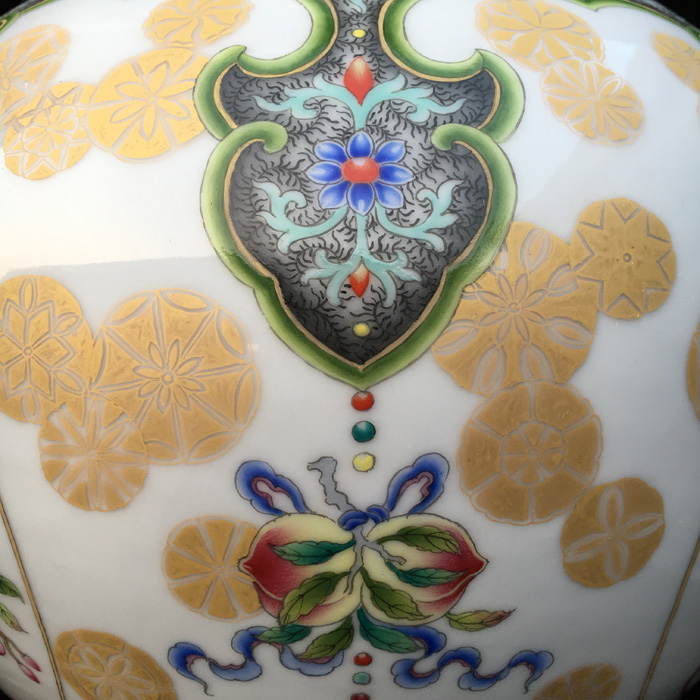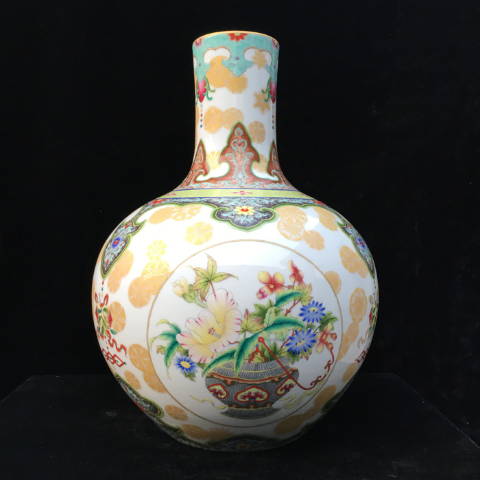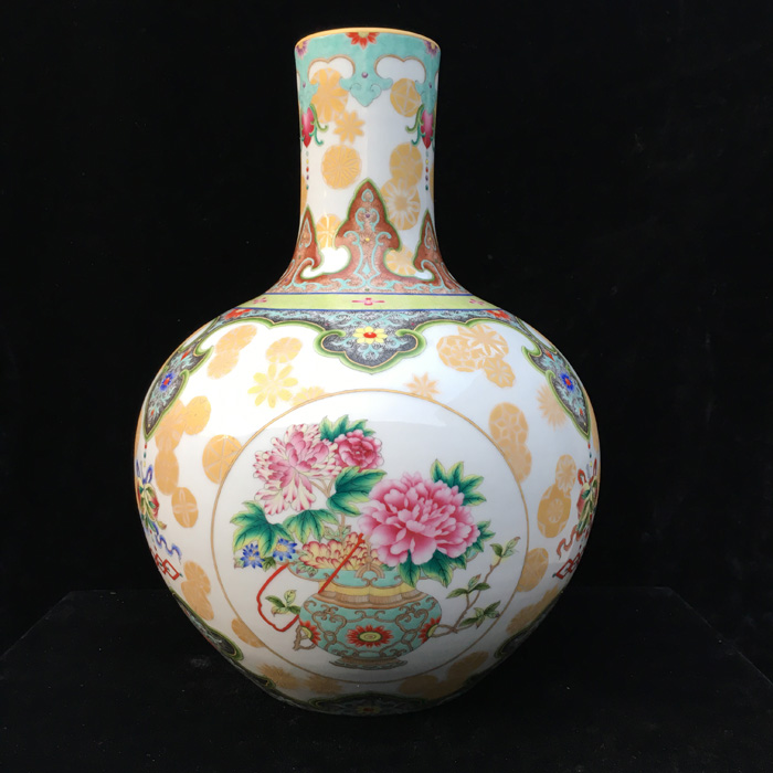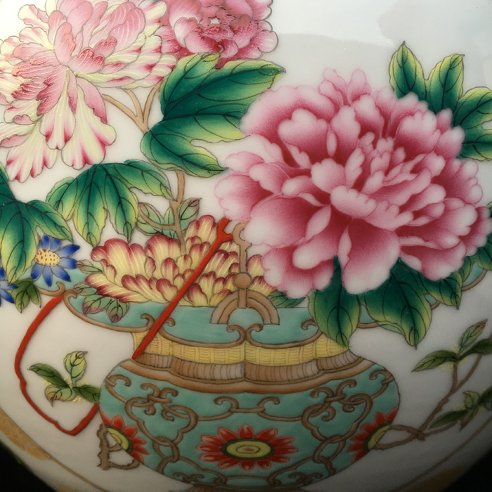 器物简介:此器直颈,丰肩,假圈足,施白釉,内无纹饰,外壁三开光,上绘博古花卉图,画面线条流畅,枝叶花朵繁简有致,颈肩部饰以极富经典吉祥寓意的如意云纹,活泼俏皮的描金团花自由的散落着,跳跃着,烘托出更加热烈的吉庆气息。喻富贵吉祥,圆满吉庆,和美幸福之意。