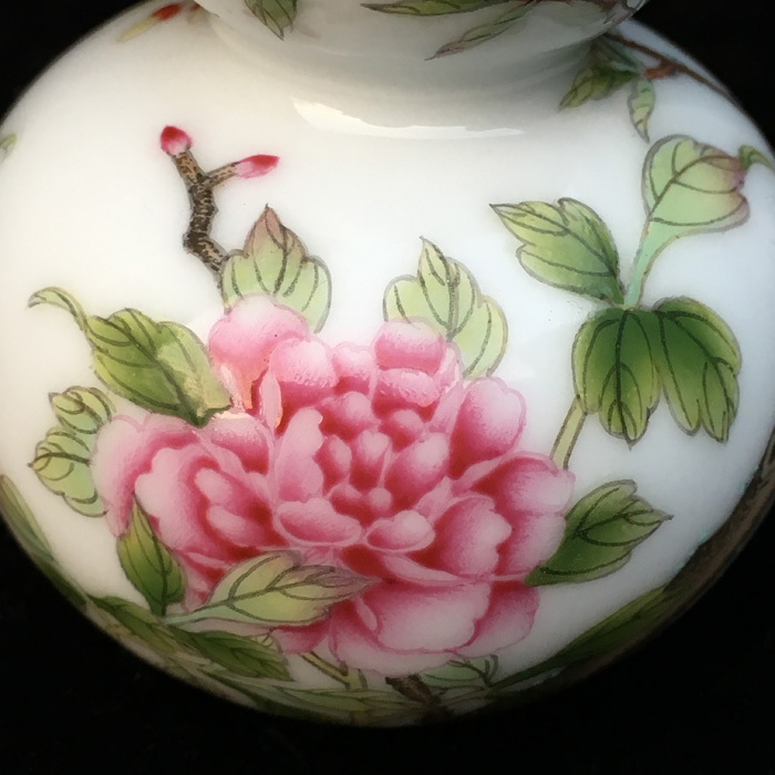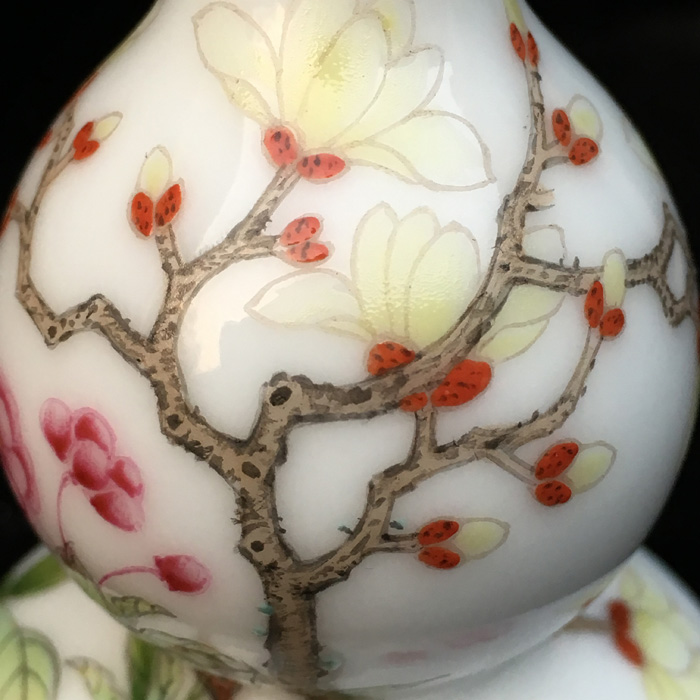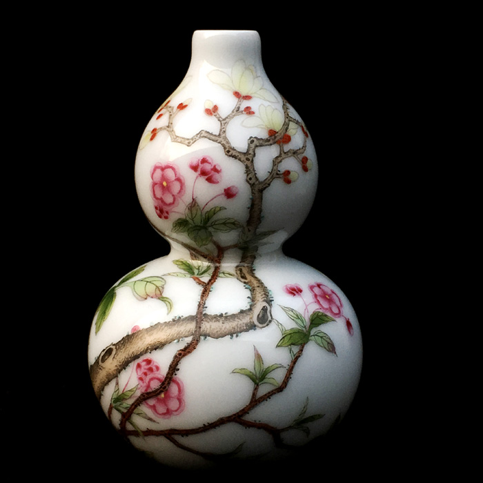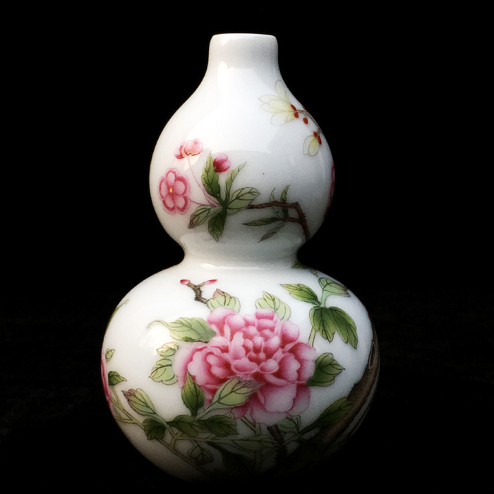 器物简介:葫芦瓶,形似葫芦的瓶式,纯手工制作的把玩件,造型小巧喜人,令人看一眼就会爱不释手。此器为两节葫芦式,短颈,施白釉,内无纹饰,外壁绘有蝙蝠葫芦图,枝繁叶茂,延绵不息。葫芦,谐音“福禄”。因它是草本植物,其枝茎称为“蔓”。“蔓”与“万”谐音,“蔓带”与“万代”谐音。“福禄”“万代”即是“福禄寿”齐全,故它是吉祥的象征。葫芦与它的茎叶一起被称为“子孙万代”喻家族人丁兴旺,福禄万代,世世荣昌之意。