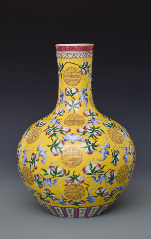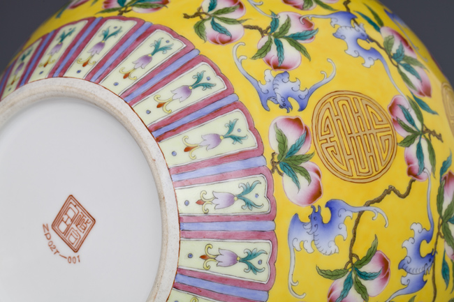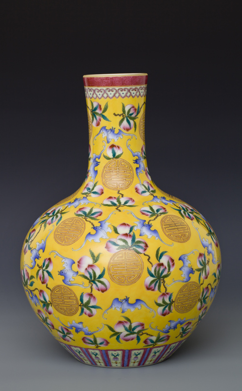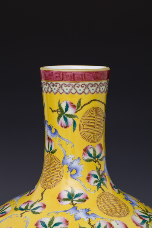 器物简介:此器瓶形为小口、直颈、丰肩、假圈足、砂底微凹,施白釉,内无纹饰,口弦绘有如意云纹,外壁满施黄地,并绘有蝙蝠,寿桃,团寿纹等吉祥图案,釉色靓丽,描绘精妙细致,整体画面极富感染力,五福捧寿的图案构造充分表现了纹饰之外特有的吉祥如意,福寿连绵之美好寓意 。