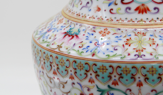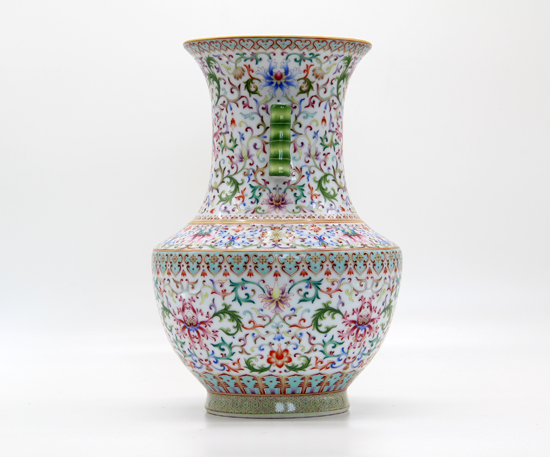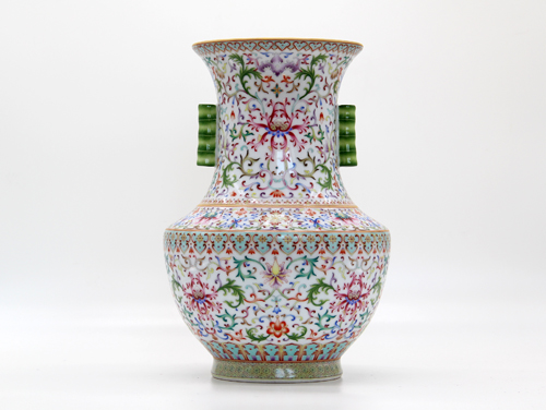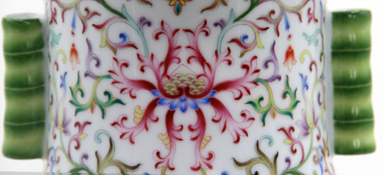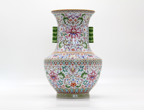 器型简介:此器因饰形似竹节双耳,故名竹节尊,撇口,丰肩,圆腹,圈足,施白釉,内无纹饰,外壁绘有藤蔓延绵的缠枝莲花纹饰,肩颈部饰以经典吉祥寓意的如意云纹,枝蔓缠绵, 温婉的诠释着画面所要表达的美好寓意。喻福寿连绵,如意吉祥,富贵昌盛之意!