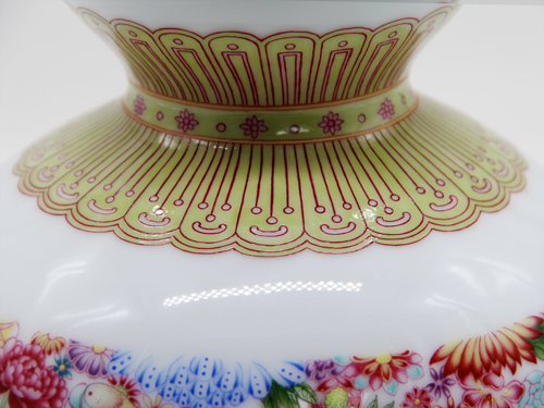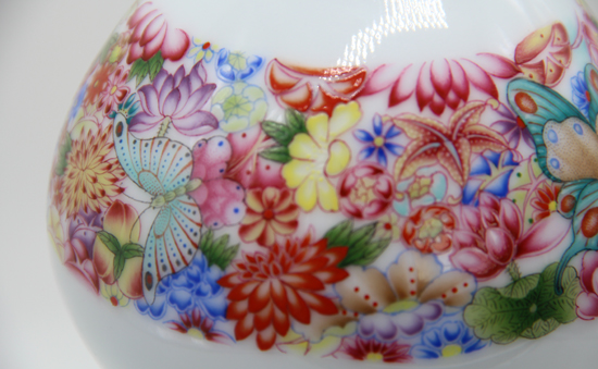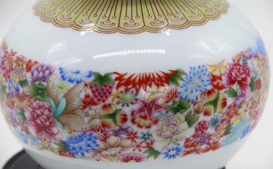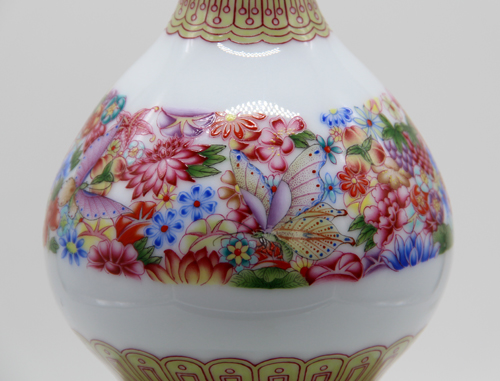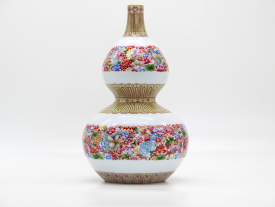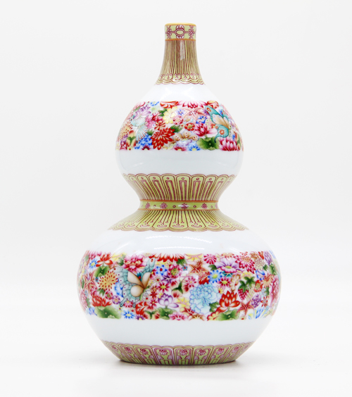 器物简介: 葫芦瓶:形似葫芦的瓶式,因其谐音"福禄",且器形像“吉”字,故又名“大吉瓶。此器为两节葫芦式,短颈,圆腹,内施白釉,无纹饰,外壁绘有各式花卉图案,花团锦簇,色彩艳丽,彩蝶斑斓飞舞其间,给人无限美好的视觉享受。