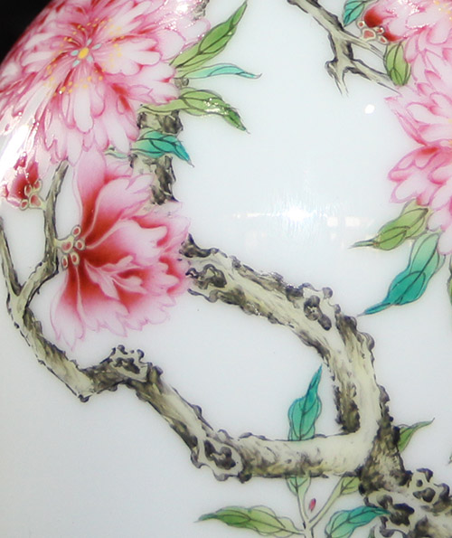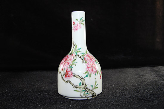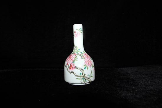 “Yao Ling Zun”is famous for its a narrow neck, a small mouth, a broad shoulder and converging belly. His name is very special, because its shape is just like a bell. The shape is characterized by a long neck, slip shoulders, a long belly, a straight belly, a ring foot and white glazed interior without painting. The exterior is painted with flowering peach patterns. The flowers are plump and full. The colour is very bright and colourful. The beautiful and refined vase symbolizes satisfaction, deep feeling, richness and auspiciousness. The three Chinese characters “Zheng He Gong” printed in red olden Chinese seal font could be found at the bottom of the vase.