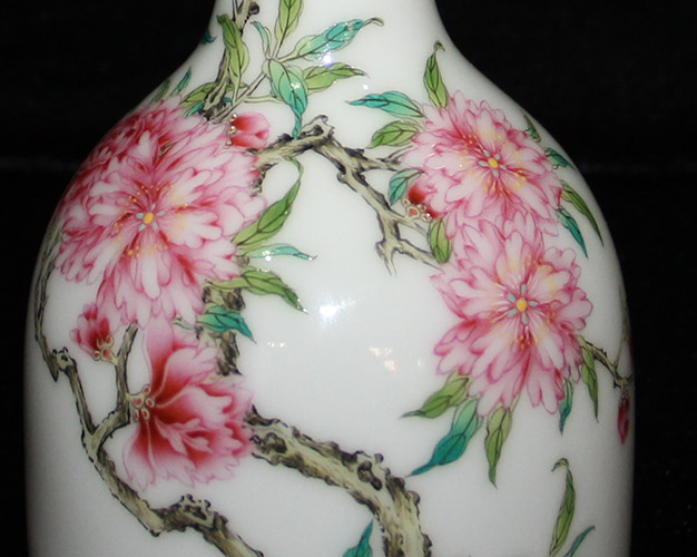 器物简介:摇铃尊因细颈小口,丰肩敛腹,形似摇铃而得名。此尊长筒形颈,斜肩,长直腹,圈足,内施白釉,无纹饰,外壁绘有碧桃图案,花朵丰腴,色彩鲜艳丰富,端庄秀雅。喻圆满, 浓情,富贵吉祥之意。底足有红料彩双方栏“政合宫”三字篆书款。