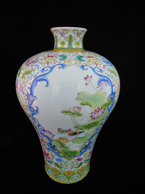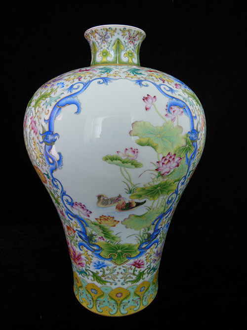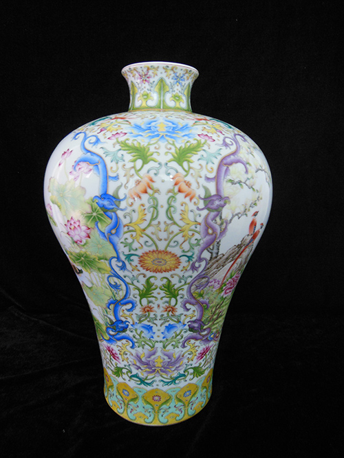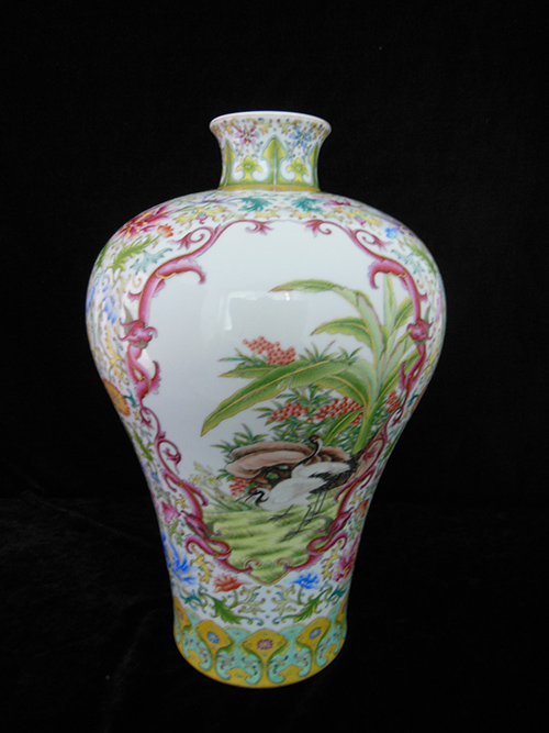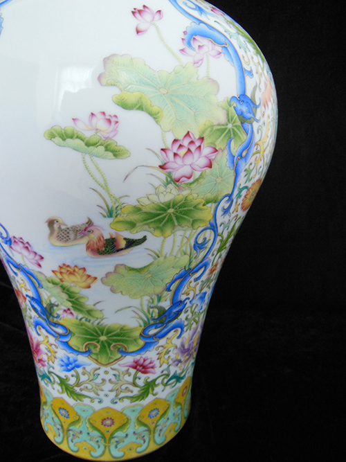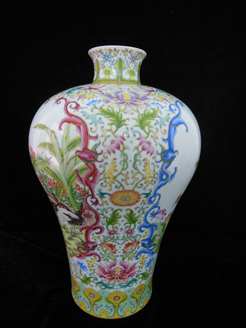 The vase is a container with a small mouth, a short neck, a broad shoulder, a narrow lower body, a ring foot, white glazed interior without painting. It got the name of “plum vase”because the small mouth allows only one spray of plum blossoms to be arranged. The exterior of the porcelain is painted with yulan magnolia, paradise flycatcher, lotus, mandarin duck, Chinese banana and red-crowned crane patterns. The drawing presents a sense of riches and honour, good luck and excitement. The picture is forthcoming affordable. The vase symbolizes honourableness, happiness, health and longevity. The three Chinese characters “Zheng He Gong” printed in red olden Chinese seal font could be found at the bottom of the vase.