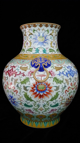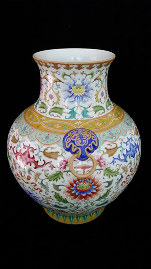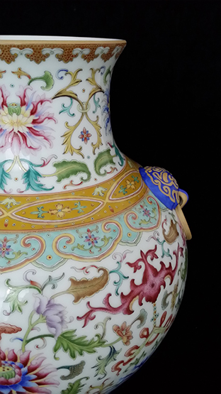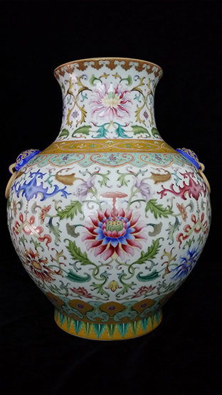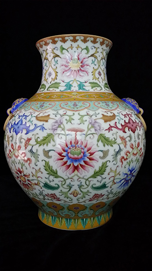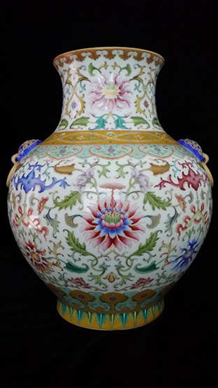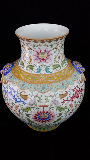 The vase is known for the two sides of the neck attached two ears. There are elephant ears, tiger ears and dragon ears vases in Jingdezhen kilns. The vase is a container with a long neck, double ears, a round belly, a ring foot,white glazed interior without painting. The neck of the porcelain is painted with Ruyi Cloud Pattern and Banana Leaf. The exterior of the porcelain is painted with glossy ganoderma, bats and Po-phase flowers. The vase symbolize good luck, happiness and longevity. The three Chinese characters “Zheng He Gong” printed in red olden Chinese seal font could be found at the bottom of the vase.