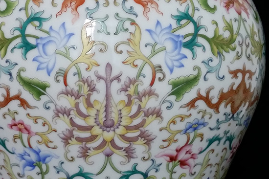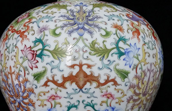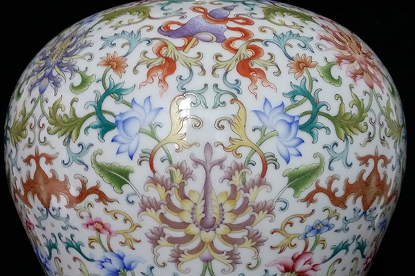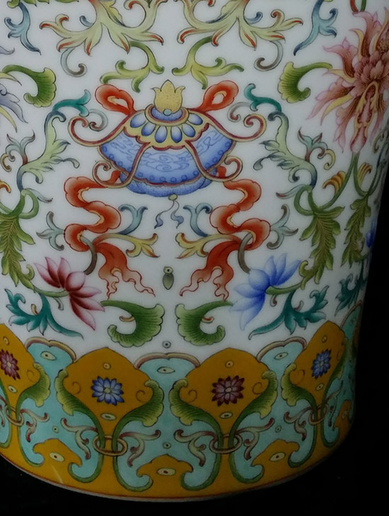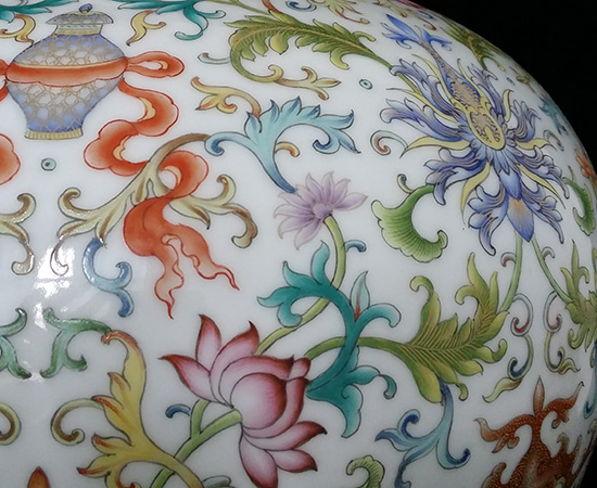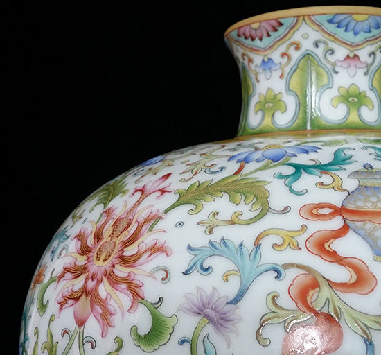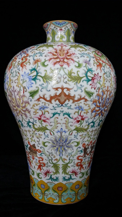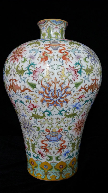 器物简介:梅瓶是一种小口、短颈、丰肩 、瘦底、圈足的瓶式,以口小只能插梅枝而得名。此器施白釉,内无纹饰,颈肩部及底足均为为如意云纹及蕉叶,外壁绘有蝙蝠,吉祥八宝,西花纹饰,画面绘工精美,纹饰疏密有致,充分表现出祥瑞喜庆,富 贵吉祥,福寿连绵之意。底足有红料彩双方栏“政合宫”三字篆书款。