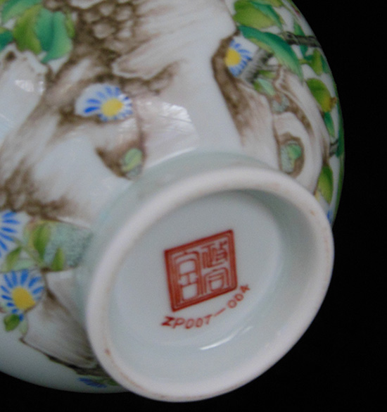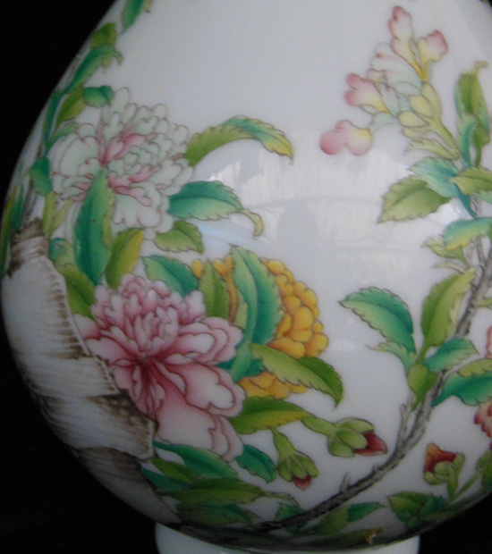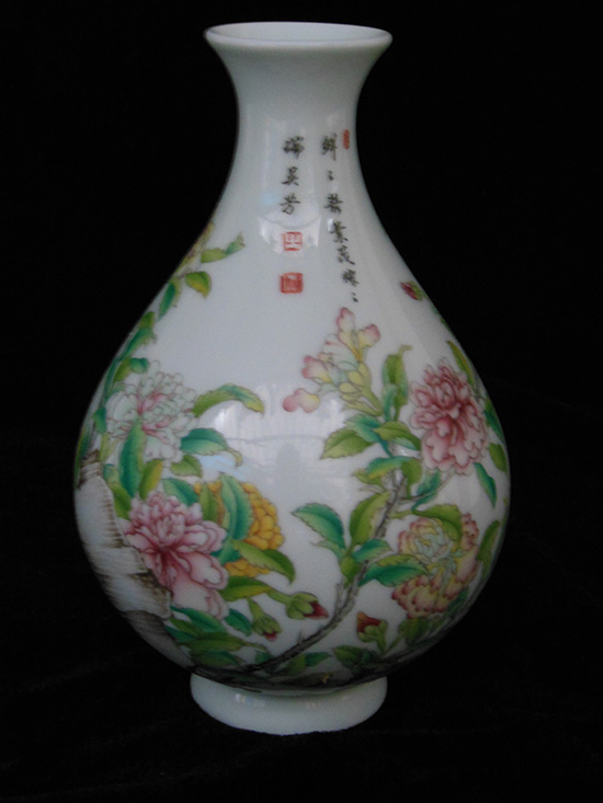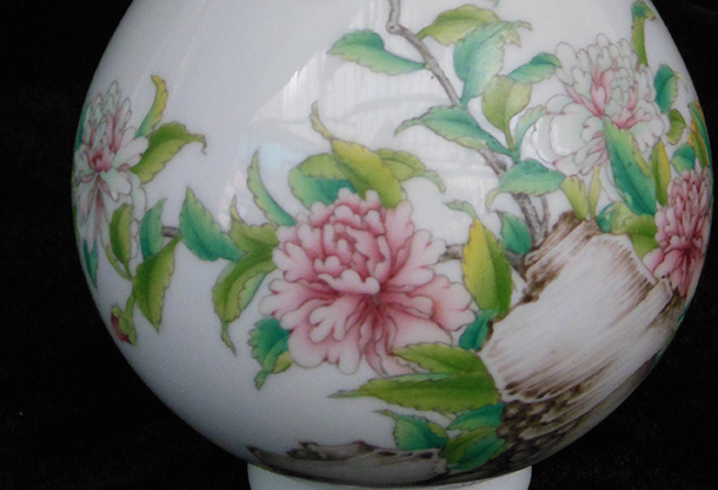 器型简介:玉壶春瓶又叫玉壶春壶,它的造型是由唐代寺院里的净水瓶演变而来。基本形制为撇口、细颈、垂腹、圈足。它是一种以变化柔和的弧线为轮廓线为轮廓线的瓶类。其造型上的独特之处是:颈较细,颈部中央微微收束,颈部向下逐渐加宽过渡为杏圆状下垂腹,曲线变化圆缓;圈足相对较大,或内敛或外撇。此器施白釉,内无纹饰,外壁绘有奇石牡丹图,花朵华贵饱满,色彩艳丽,诗画一体,令整个画面更显华丽高贵。喻荣华富贵,吉祥和美,昌盛繁荣之意。底足有红料彩双方栏“政合宫”三字篆书款。