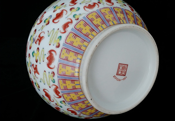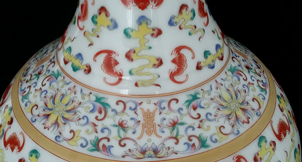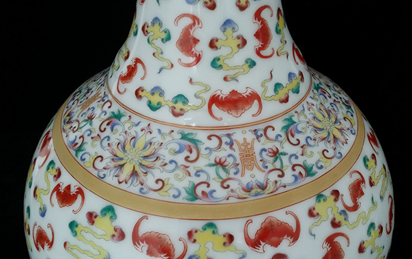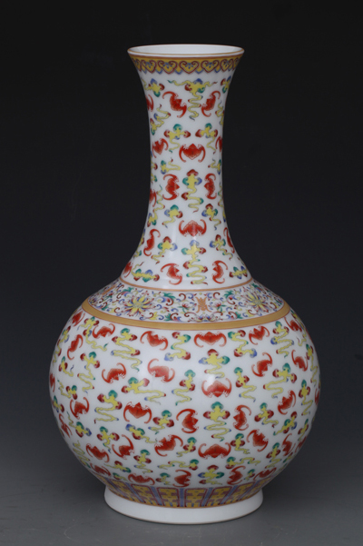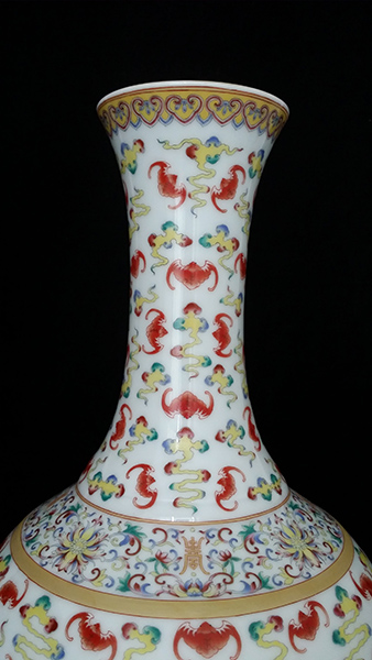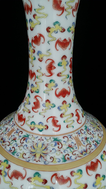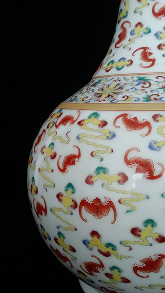 器型简介:依据清光绪年云蝠纹赏瓶相关资料制作。此器撇口,细长颈,肩部装饰凸弦纹,圆腹,圈足,施白釉,内无纹饰,外壁满绘五彩祥云及红色蝙蝠,色调明快艳丽,充满吉庆气息。喻洪福齐天,吉祥如意,健康长寿之意。 底足有红料彩双方栏“政合宫”三字篆书款。