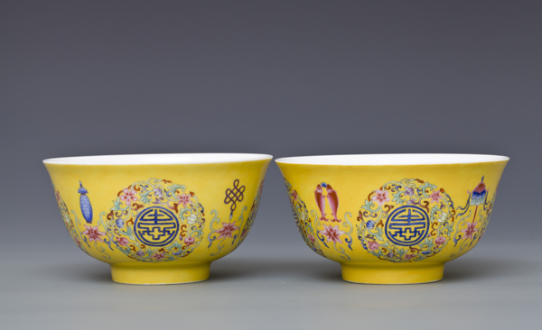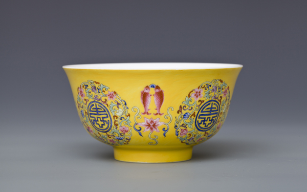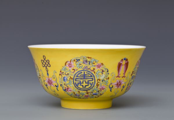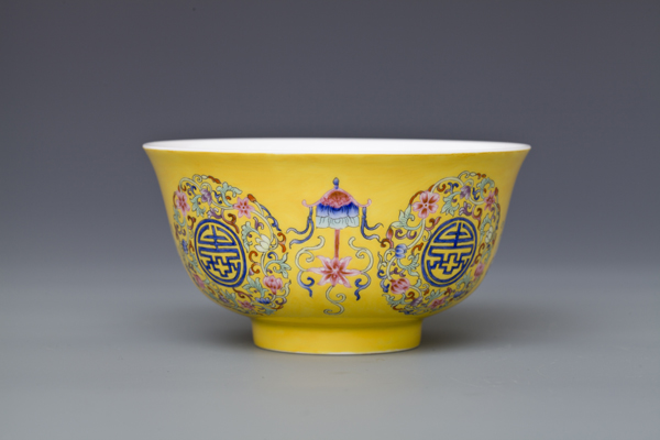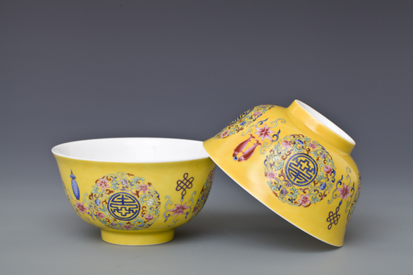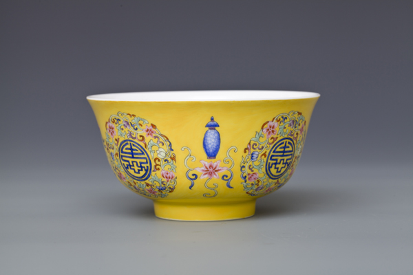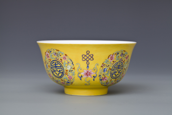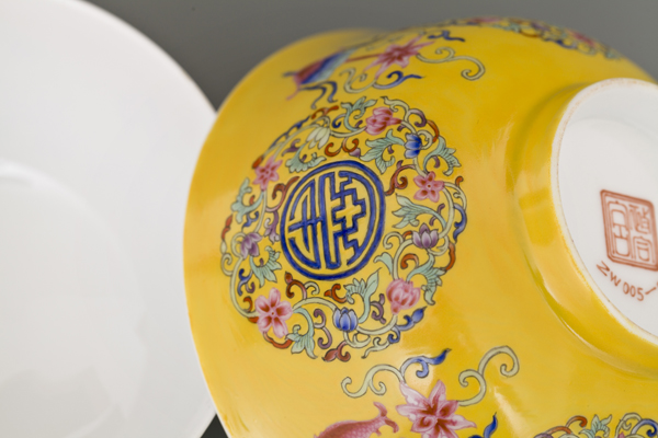 器型简介:此作品依据清乾隆时期之珐琅彩黄地轧道团寿纹碗相关资料制作。碗撇沿,腹部轮廓线缓收,腹部微丰,圈足。此器施白釉,内无纹饰,外壁满施黄色地,上书四个蓝“寿”字,外环缠枝花,团花间隔处饰四组勾莲和四宝纹吉祥图案。 喻福寿延绵,吉庆有余,富贵美好之意。