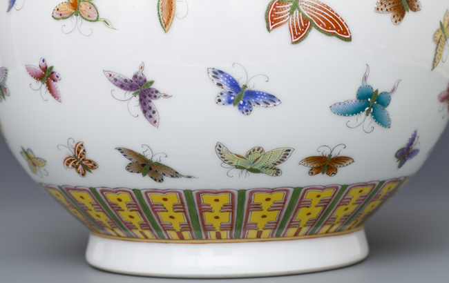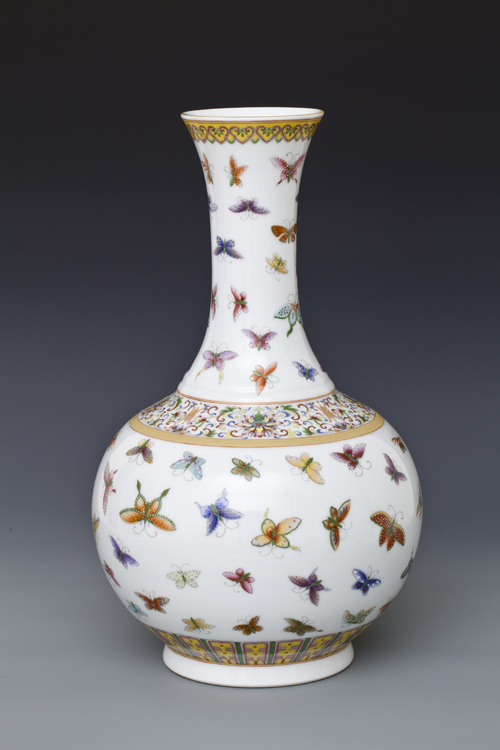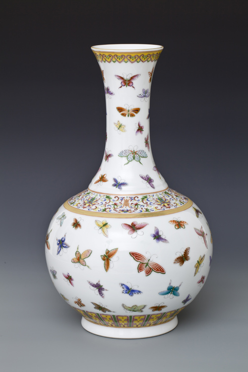 器型简介:作品依据清光绪年粉彩百蝶图赏瓶相关资料制作。此器撇口,细长颈,肩部装饰凸弦纹,圆腹,圈足,施白釉,内无纹饰,口部饰如意云头纹,肩部饰缠枝花托寿字,肩部凸棱及口、底边描金,颈部腹部绘颜色各不相同、姿态各异的近百只蝴蝶,线条简练,色彩斑斓明快, 故名百蝶瓶。喻热情坚贞,吉祥和美,幸福长寿之意。