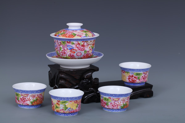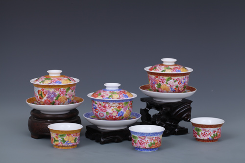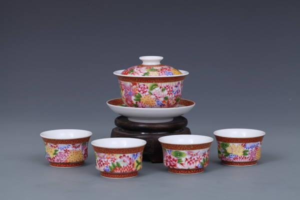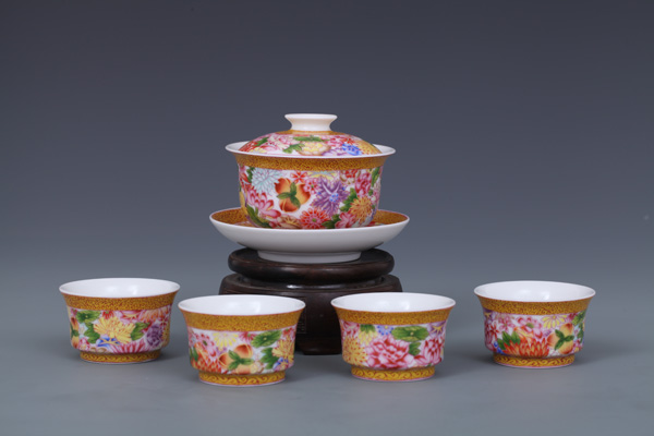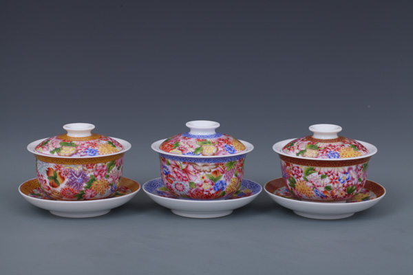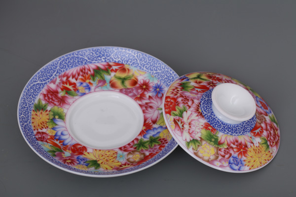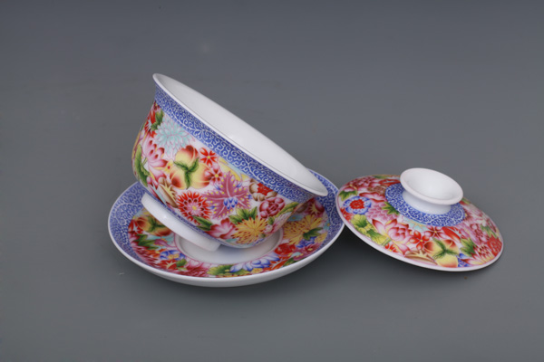 器物简介:此器撇口,圈足,施白釉,内无纹饰,外壁满绘各色花卉,花团锦簇可谓万艳齐芳,此图案又称“百花不露地”,喻“万花献瑞,富贵吉祥”之意。