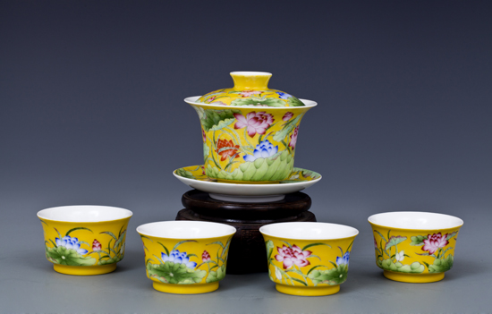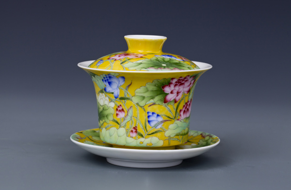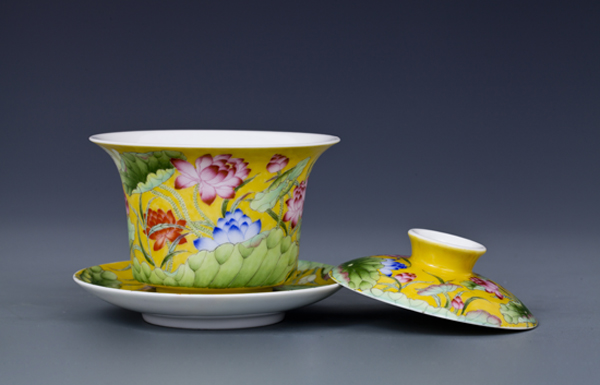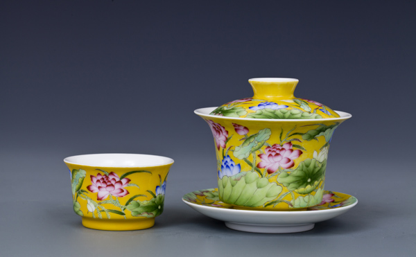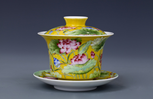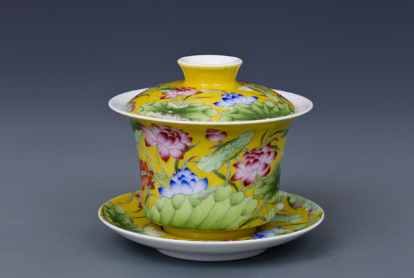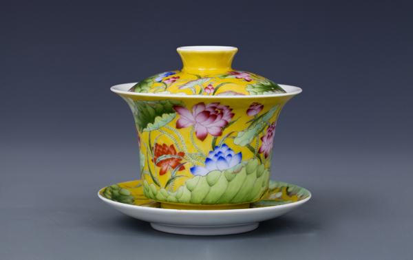 器物简介:此器撇口,圈足,施白釉,内无纹饰,外壁纯手工满施黄色地,上绘各色或盛开或含苞之荷花,线条简练朴实,色彩真实艳丽,层次感鲜明,黄色地的映衬下,愈发显得婀娜多姿,美不胜收。喻品质高洁,静心清廉之意。 底足有红料彩双方栏“政合宫”三字篆书款。
