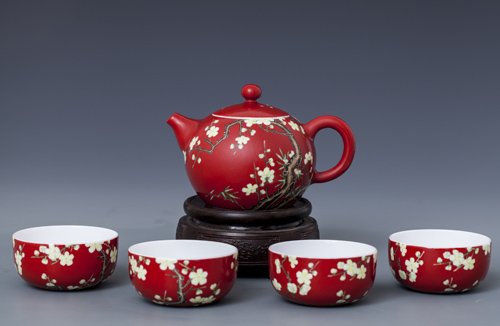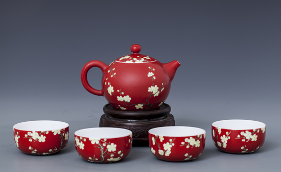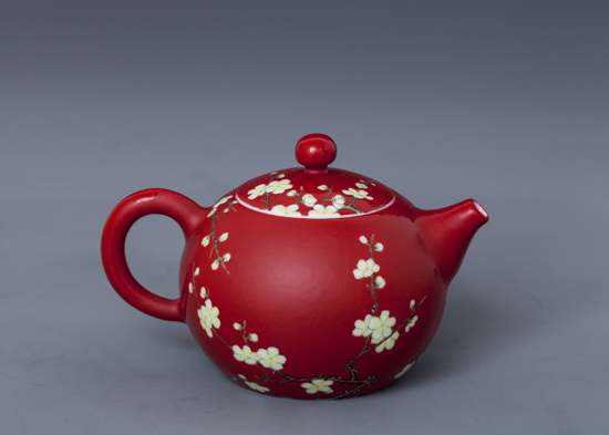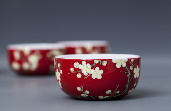 器物简介:此器腹扁圆,圈足,施白釉,内无纹饰,外壁纯手工满施红色地,上绘梅树一株,枝干苍劲,其上满开白色梅花,树后另有矮翠竹数枝图案,线条简练,精妙的套色技艺令花朵,枝干极具真实质感。喻骨格清奇,气质高洁之意。