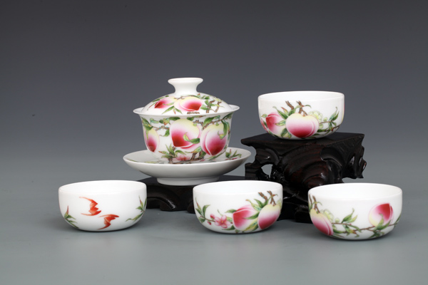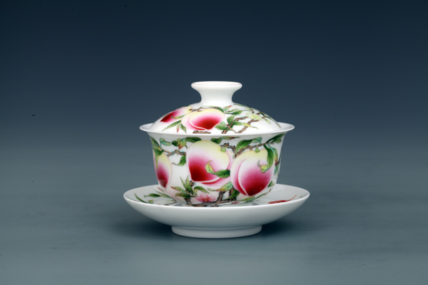 器物简介:此器碗敞口,弧壁,圈足。盖敞口,浅弧壁,施白釉,内无纹饰,外壁绘有经典吉祥寓意的九桃图。画面线条明快流畅,政合宫特有的套色技艺令枝叶果实愈显逼真,极富层次感,立体感。喻福寿安康,万代久长之意。