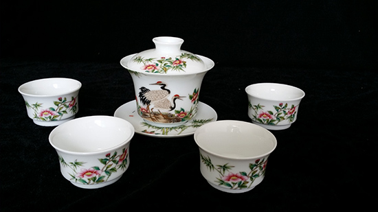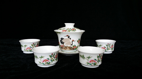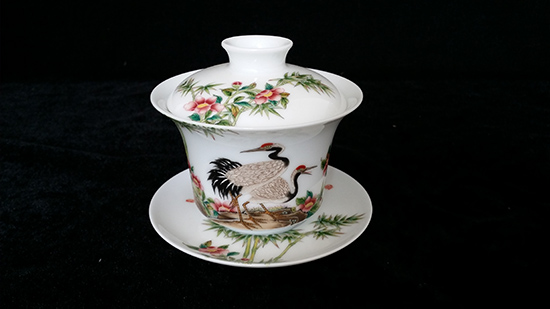 器物简介:此器撇口,圈足,内壁白釉无纹饰,外壁绘有绿竹,仙鹤,灵芝等,诗画一体,动静相宜。喻品质高洁,平安长寿之意。