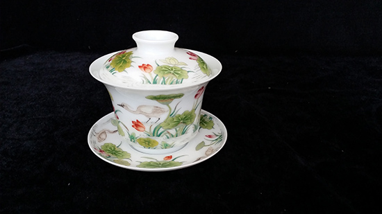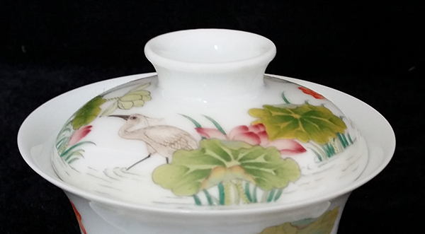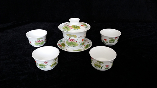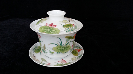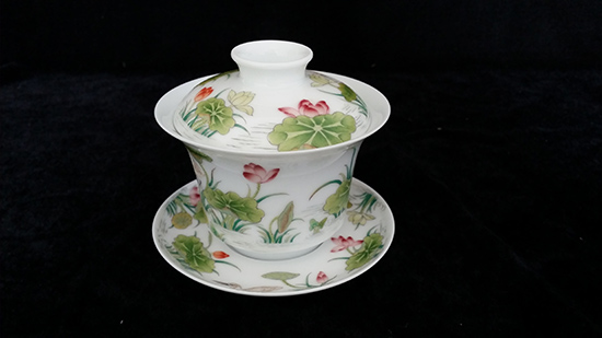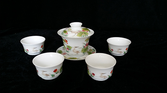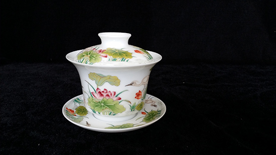 珐琅彩荷花白鹭图盖碗套组