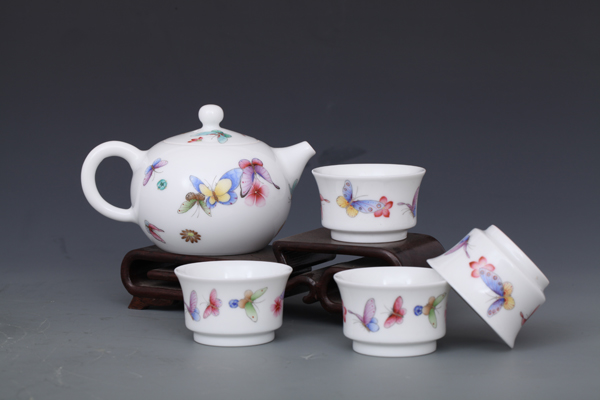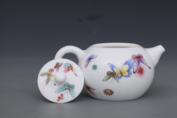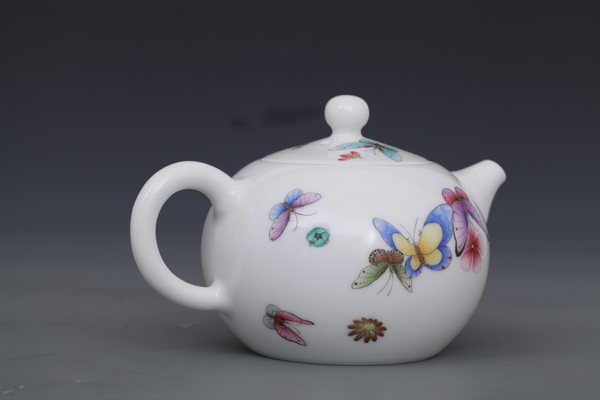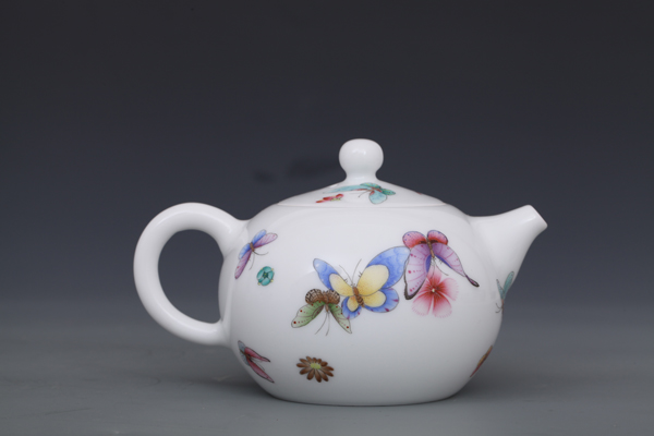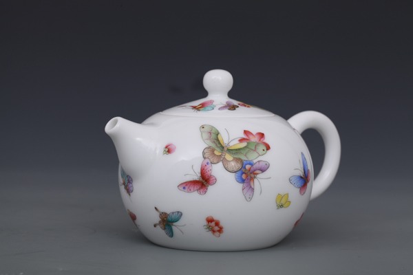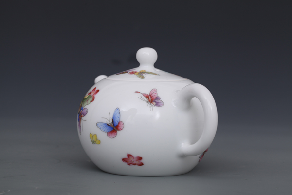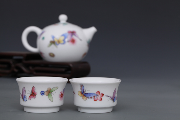 此器腹扁圆,圈足,施白釉,内无纹饰,外壁绘有色彩斑斓的蝴蝶。蝴蝶以其身美、形美、色美、情美被人们欣赏,历代咏诵。喻甜蜜幸福,爱情坚贞,美好吉祥之意。底足有红料彩双方栏“政合宫”三字篆书款。