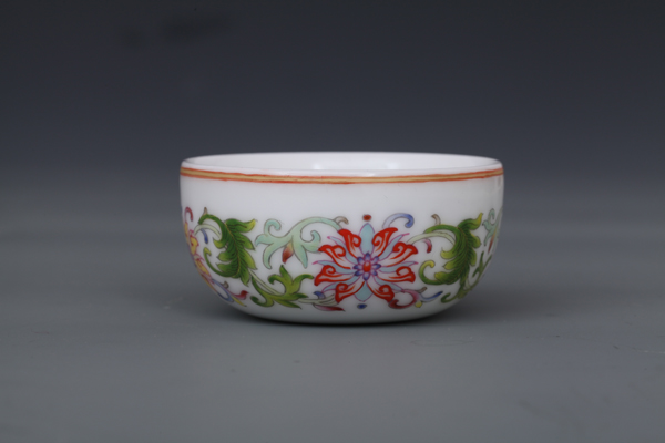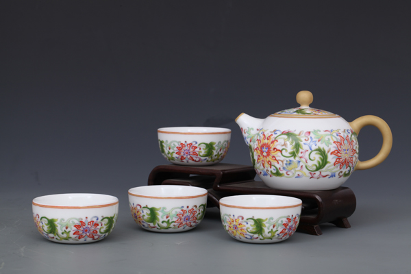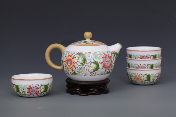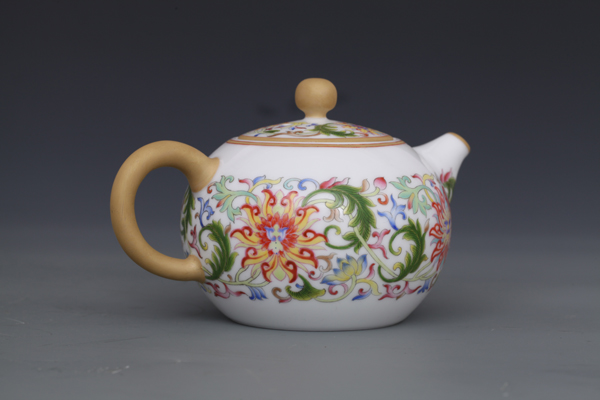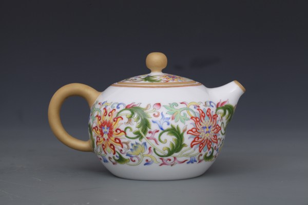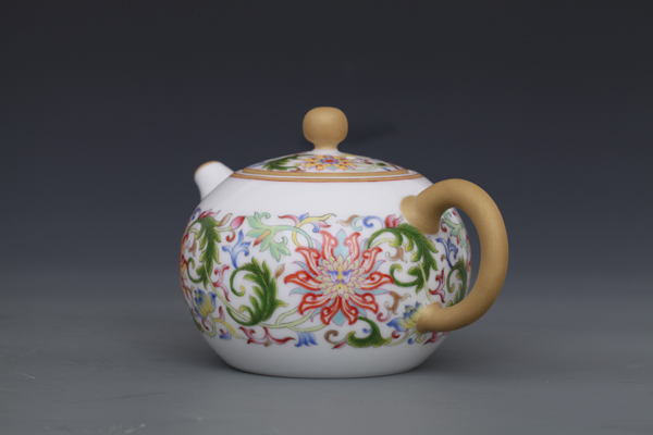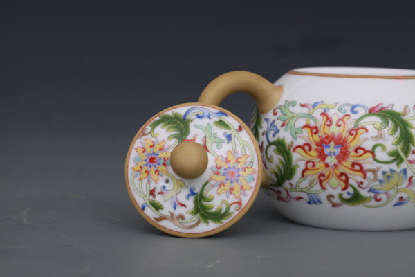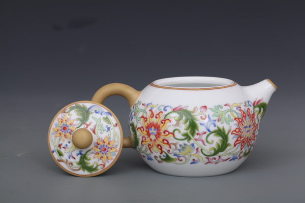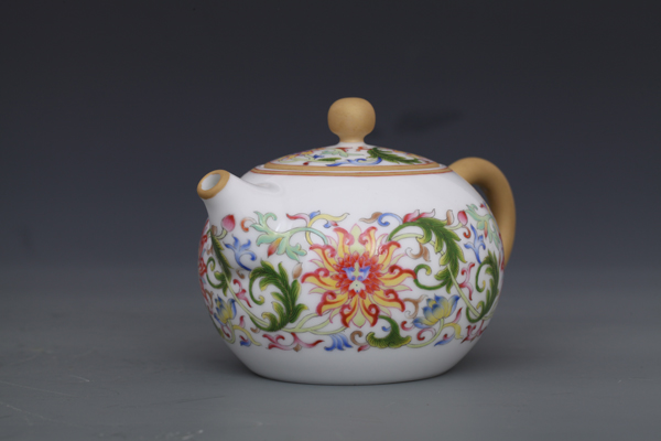 器物简介:此器腹扁圆,圈足,流,柄,钮,口弦均描有24K金,施白釉,内壁无纹饰,外壁绘有缠枝莲花图案,花枝缠绵不断,莲花观之不尽,喻“出污泥而不染,濯清涟而不妖”之意。底足有红料彩双方栏“政合宫”三字篆书款。