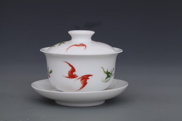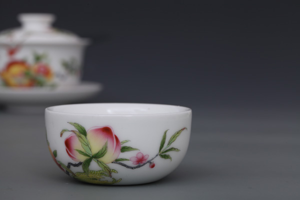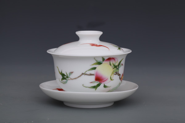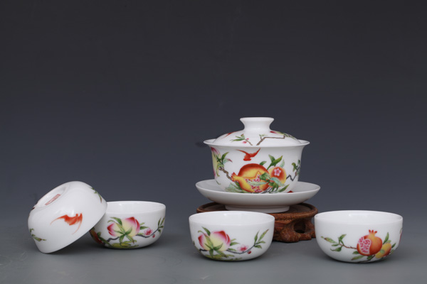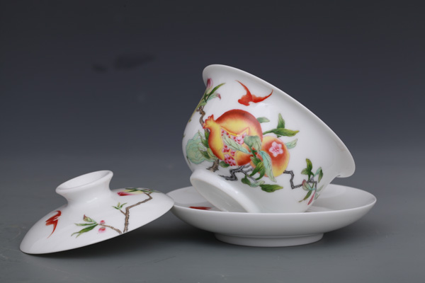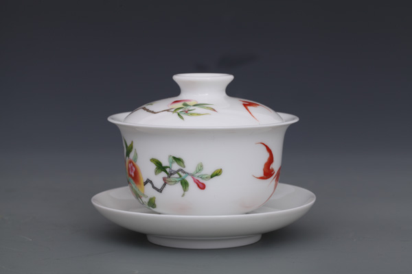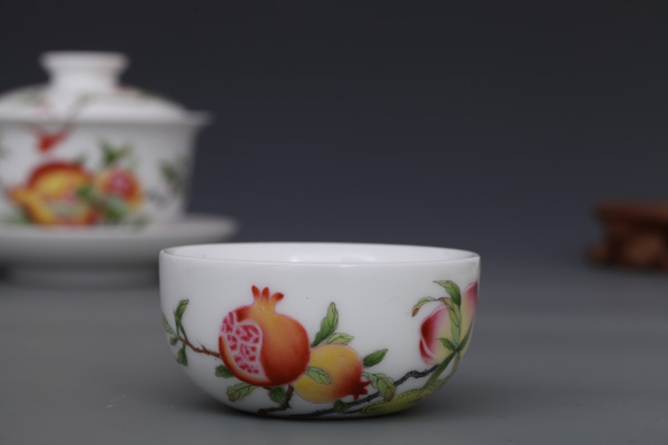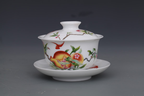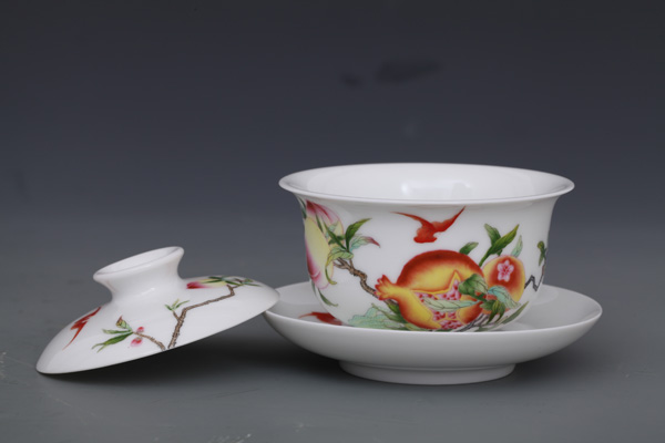 器物简介:此器敞口,弧壁,圈足,施白釉,内无纹饰,外壁绘有寿桃,石榴,蝙蝠图案,画面色彩真实,果实富有质感,饱满喜人。喻洪福天齐,多子,多福,多寿,乐享天伦之意。
