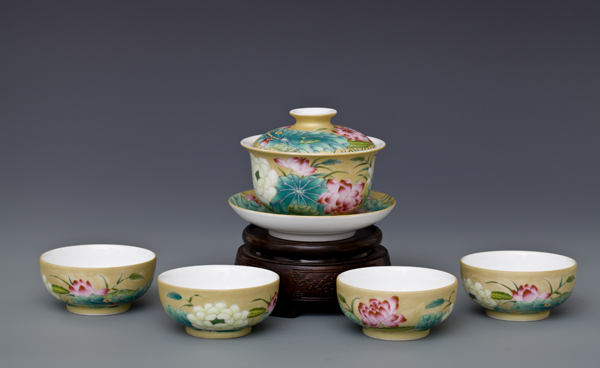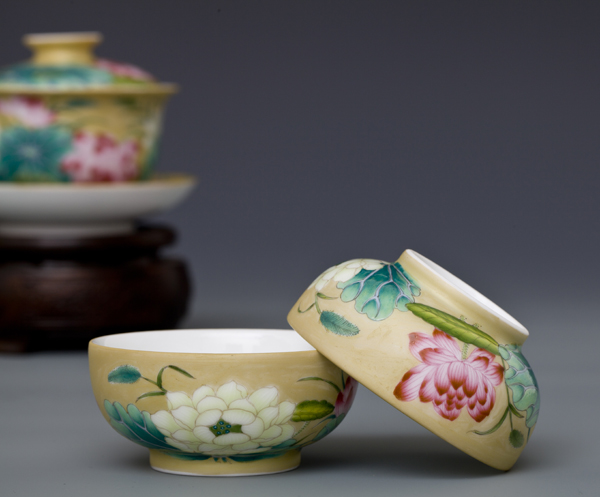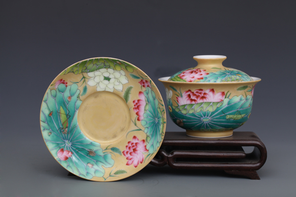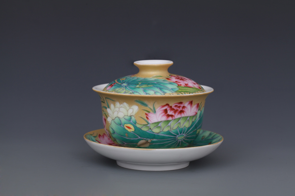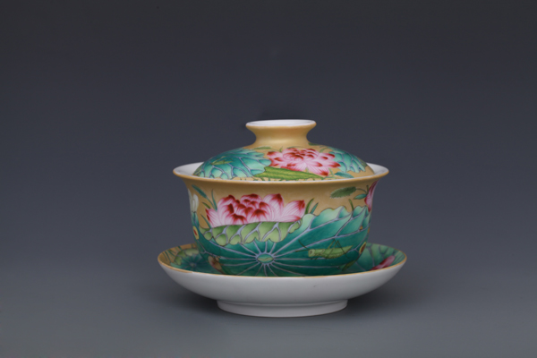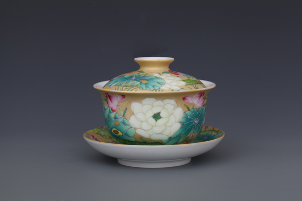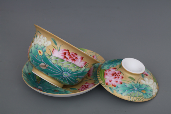 器物简介:此作品依据清乾隆金地莲花纹盖碗相关资料制作。碗敞口,弧壁,圈足。盖敞口,浅弧壁,器内壁白釉无纹饰,外壁为金彩地绘有各色盛开的荷花图案,凋萎的荷叶上卧有螳螂与天牛,图案在金色地的衬托下越显得富丽,画面色彩极富真实感。喻清廉,坚贞、静心雅致,气质高洁之意。