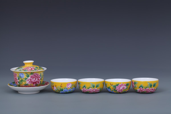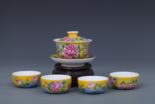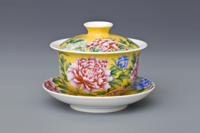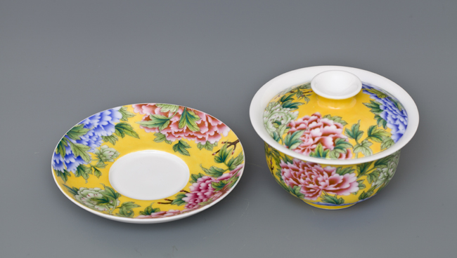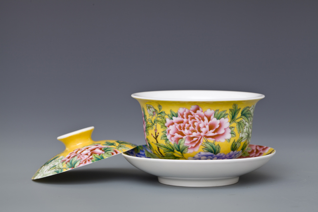 器物简介:此作品依据清康熙珐琅彩黄地牡丹纹碗相关资料制作。碗敞口,弧壁,圈足。盖敞口,浅弧壁,器内壁白釉无纹饰,外壁纯手工施黄地,并以渲染方式彩绘粉,蓝,绿,紫各色国色天香之牡丹花,画面布局疏密有致,画工严谨细腻,色彩层次分明,在黄色地的衬托下整体画面更富立体感。喻华美和谐,富贵吉祥之意。