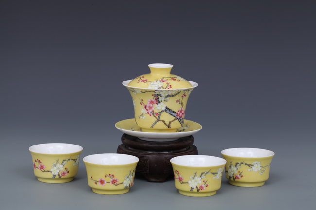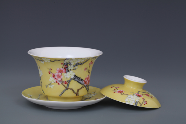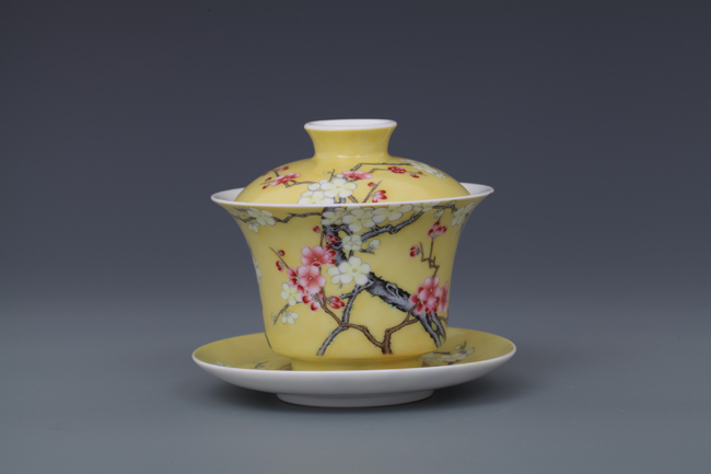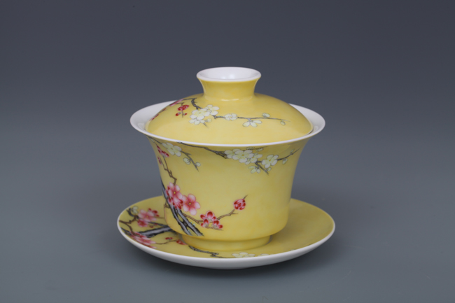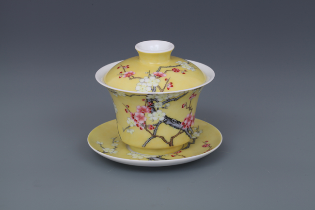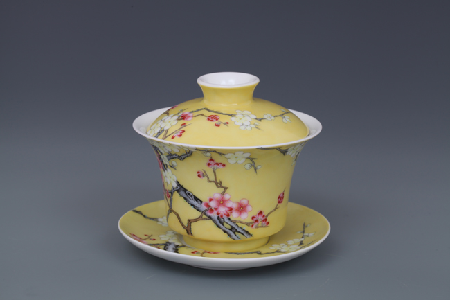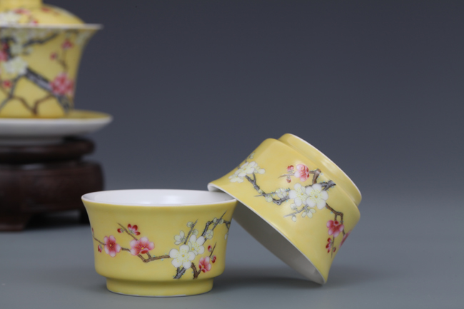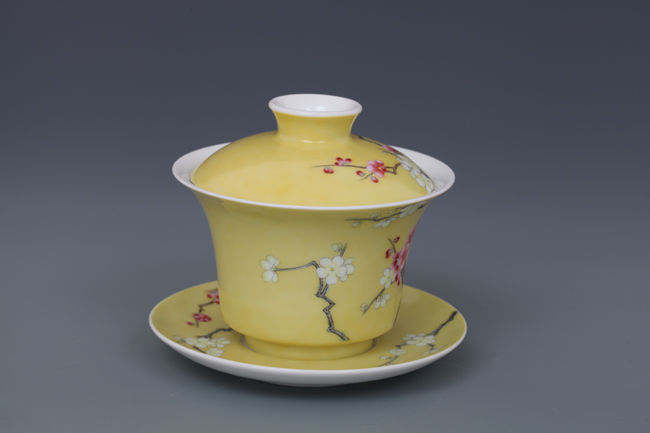 器物简介:此器撇口,圈足,施白釉,内无纹饰,外壁纯手工施黄色地,绘有双色梅花,生机勃勃,冰肌玉骨,凌寒留香,画面线条朴实简练,色彩真实。喻高洁,坚强,谦逊之意。